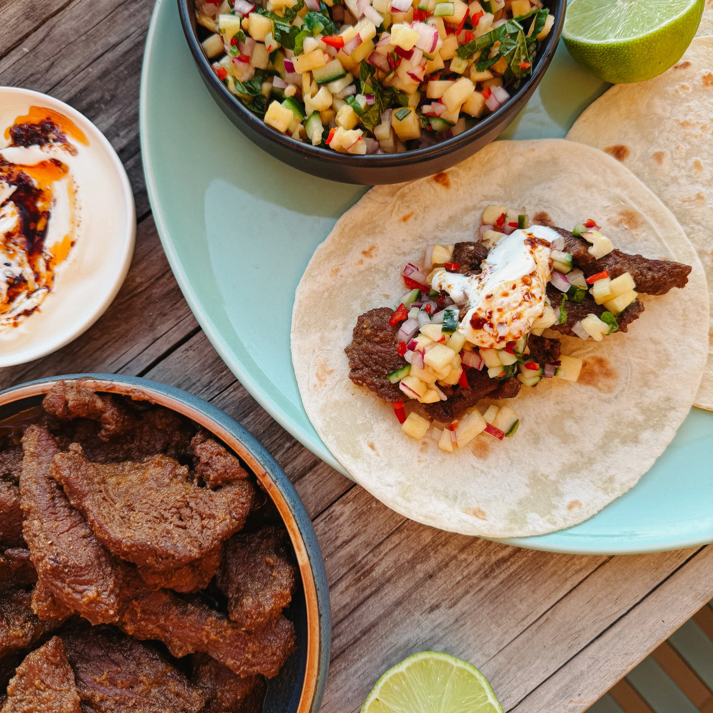 Serve the the roo with the salsa, heated soft tortillas and greek yoghurt topped with chill oil.
